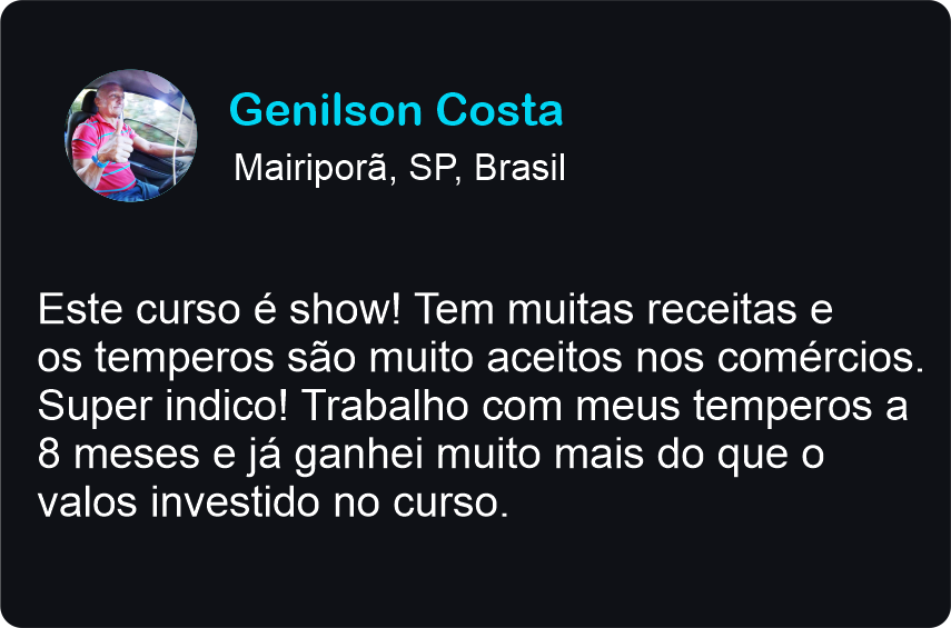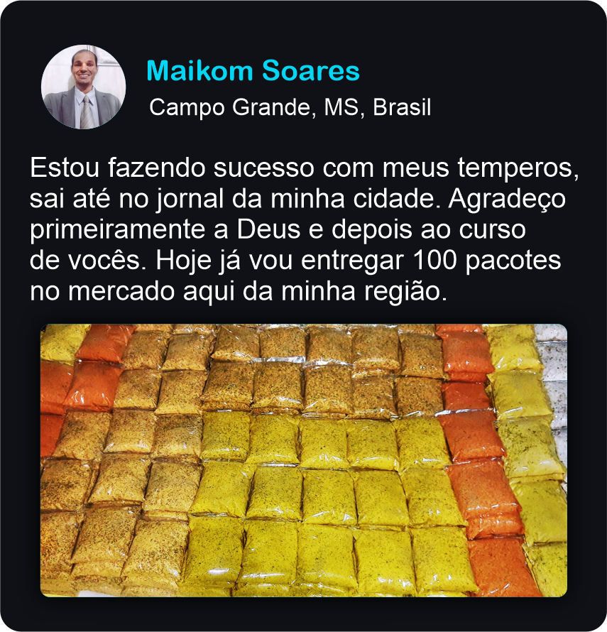 Estou fazendo sucesso com meus temperos, sai até no jornal da minha cidade. Agradeço primeiramente a Deus e depois ao curso de vocês. Hoje já vou entregar 100 pacotes no mercado aqui da minha região.